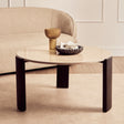 This round coffee table has a cream marble top in a smooth finish, offering a touch of luxury to the living room. Crafted from black finish acacia wood, its sturdy legs create a striking and visually appealing design, making this monochromatic coffee table a perfect focal point for modern living rooms.