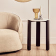 This round side table has a white marble top in a smooth finish, offering a touch of luxury to the living room. Crafted from black finish acacia wood, its sturdy legs create a striking and visually appealing design, making this monochromatic side table a perfect focal point for modern living rooms.