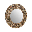 This eye-catching round wall mirror boasts a natural and organic aesthetic. The pebble-shaped seashells in various natural colours and sizes are carefully carved and arranged to create an airy bubble pattern on a black resin frame. This combination of natural elements and modern design creates a visually intriguing wall mirror, resulting in a sophisticated and airy space.