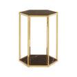 The luxe style Piermount end table has a frame crafted from smooth, solid stainless steel. The frame has a hexagonal design and a reflective gold finish. Black marble is set into both top and bottom this table will complement any living space in your home