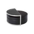 The semicircular coffee table is created from smooth stainless steel with a reflective silver finish, while black marble adds an elegant touch to the table's top. The black faux leather footstool nests comfortable underneath the table when not in use.