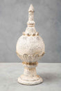 This white ball shaped urn is made of fibreglass, which makes it lightweight enough to display safely on accent tables, but produces the effect of white, distressed stone, lending it an antique appearance.