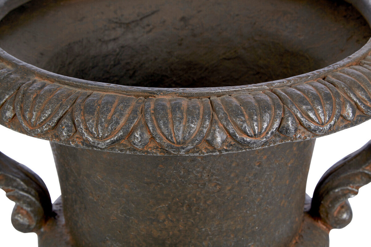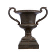 Formed from strong and lightweight fibreglass, this highly textured decorative urn evokes antique style with its weathered brown colour and speckled texture. Imitating the style of classical urns.