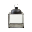 Exhibiting a vintage style in a black metal finish, this large lantern boasts a geometric shape with transparent glass shades neatly held in a cuboid fixture. This lantern exudes warmth and illumination to the living area through the glass panels.