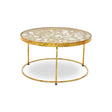 Skilfully handcrafted, this side table features a clear glass top accentuated with a series of gold foil coated butterflies. Slender gold finish textured frame enhances the luxe glamour of this contemporary piece of art.