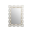 Its slim iron frame has a champagne finish that coordinates with silver coloured metallic lighting and accessories. A series of small rectangular mirrors form a pattern around the frame, adding depth and volume to this distinctive piece.