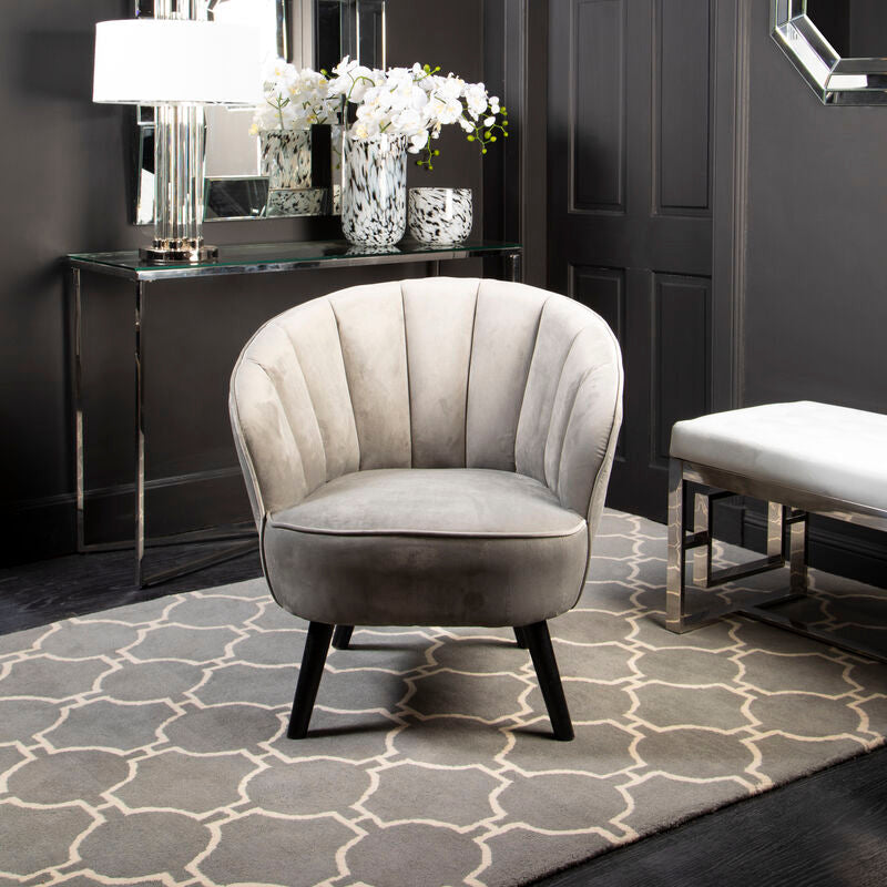 ""Upholstered in tactile grey velvet, this elegant chair has a thick padded seat with rounded backrest forming a scalloped design. The channel-tufted detail on the backrest adds bold texture. The chair's renewable rubberwood legs are angled and offer a smooth counterpoint to the plush velvet upholstery."