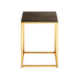 Its sleek base is made from smooth iron, and boasts a rich brass finish that coordinates with warm metallics. A square slab of petrified wood sits atop the frame. The wood, formed over millions of years, allows one to introduce a unique and ancient form into a contemporary design setting. Its black colour counterpoints the brass tones.