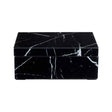 The Streaks of white pattern on its surface, creating a marble effect that give it a textured look. Its inside is covered with soft black fabric to complement the exterior and provide a tactile finish. Very subtle black feet raise the box slightly form the surface.
