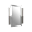 The large rectangular mirrored frame is flanked by two smaller siblings. Bevelled corners add depth to the design. Black lines trim the sides, creating a contrast that brings a hint of monochrome to the look.
