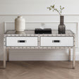 The beautiful, smooth mirrored finish of the coffee table, with two drawers and open glass shelf, is further accentuated by rivet detailing on the frame for a functional and fashionable piece in your bedroom. The frame of the table is made from durable stainless steel ensuring sturdiness, and with its polished finish, it matches the mirrored surfaces.
