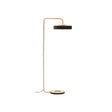 This floor lamp introduces clean sophistication with sleek and minimal base in the warm gold stand. The luxe tubing is supported with a round base while it gently bends to support a spun frame in the black finish.