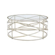 The frame of the table is made from tough iron and has a metallic silver finish. The iron is distressed, giving the table's frame and the latticed outer a textured look. Set into the top is a pane of clear tempered glass. Part of the contemporary Rubia collection, coordinate it with the matching coffee table.