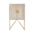The cabinet is crafted from sustainable mango wood with a whitewash finish. Both doors are textured by the circular carving, and the handles feature an antique brass finish that complements the minimal legs.