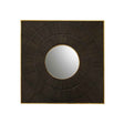 The circular mirror is inset within the frame, creating a smooth transition between the reflective surface and the textured wood. The frame is bordered by a gold-toned metal edge. The deep grooves and the natural wood grain create a sense of tactile appeal.