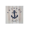 A panelled whitewash surface has a weathered finish which accentuates the rustic style. The blue anchor and rope graphic and famous sailor slogan enhance its marine roots. A metal hook on its back makes it easy to hang on the wall.