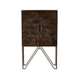 The Saira cabinet is handcrafted from renewable mango wood. Its two doors are patterned with geometric carvings, and the slim iron handles feature a metallic antique brass finish. The cabinet is supported by angular iron legs. *This item is handcrafted so please expect slight variations to the finish*