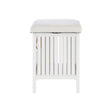 This stool features a box shaped, renewable pine wood frame in a white finish that is topped with a padded fabric seat. It provides ample space to store bathroom clothing and other accessories under its flip-open seat. The slatted design contributes to its visual appeal allows one to see the contents inside.