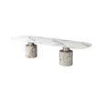 A modern statement piece, this dining table features a sleek white marble top with rounded corners. The table has cylindrical white marble legs and polished stainless steel supports, elevating the elegance of the design.