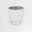 This contemporary accent piece features an octagonal top surface made from black tempered glass. Beneath the glass, the thin stainless steel legs are formed into quadrilateral and triangular shapes, descending to a symmetry-producing octagonal base.
