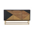 This sleek and contemporary sideboard is made from black and brown oak and features geometric brass panels across the front, and is supported by sturdy gold finish stainless steel linked legs.