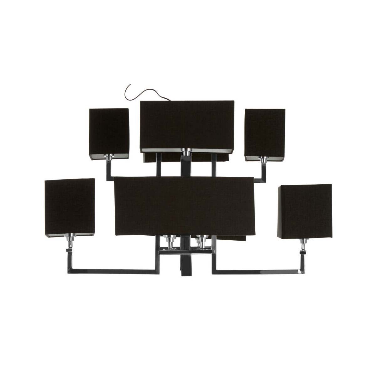 Each light has an acrylic shade covered with black textured fabric contrasting the silver tones of the holding stand. Their square and rectangular shapes form a symmetric design aesthetic and the fabric helps them to cast an ambient glow.