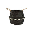 This woven basket is created from sustainable seagrass and boasts a sleek black finish. The seagrass loop handles at each side of the basket's opening retain their natural light colour. A white pom pom trim around the centre of the basket contrasts with its dark colour and adds a decorative flourish.
