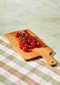 Crafted from acacia wood, this paddle board has a curved design in mild graining and texture. Its wide, rectangular surface is designed for cutting and chopping fruits and vegetables, complemented with a handle and hanging hook for efficient storage.