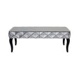 Its smoked glass top offers a muted counterpoint to the silvery drawer facings. The 3D geometric design adds to its distinctive aesthetic. The wood legs are coloured black for a stark tonal contrast.