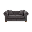 Upholsterd in grey fabric, this two seater sofa boasts rolled arms and a tufted backrest designed for maximum comfort. The chic brown wooden legs perfectly complement the grey upholstery, adding style and sophistication.