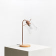 This modern table lamp has a cylindrical glass shade supported by a gold finish curved iron rod, adding a luxe accent to its design. The rod is supported by a natural-finish rubberwood base, complementing its modern design. The light offers a striking glow with its glass shade and creates a classic elegance that looks visually appealing in the living room and hallway.