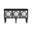 This sideboard features a circular lattice overlay on convex mirrors that are fixed neatly on the sides. Lending space and illumination to the living area, this sideboard is elevated by sturdy tapered legs and it is ideal for displaying and storing items.