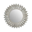 This sunburst design wall mirror features a nickel finish iron frame and a reflective mirrored centre. It has a luxurious texture and two layers of pointed shards in metallic silver, making it a contemporary focal point.