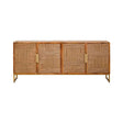 This four door modern sideboard is crafted from mango wood, featuring a natural finish paper rope design on its doors along with gold polished metal handles. The sideboard is supported by a gold polished U shaped legs, accentuating its rustic charm.