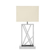 ""The square stainless steel body features four intersecting lines, and is supported by a chunky base. The reflective surface of the steel is contrasted by the subdued cream fabric shade."