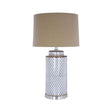 Made from beautiful and durable ceramic, the cylindrical base of this table lamp is notable for the smaller tiered section at its summit. Its smooth white surface is decorated with a series of interlinked diamond shapes, which together produce a striking geometric accent.