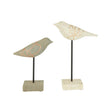 ""These two bird sculptures are crafted from renewable mango wood in a white and grey wash finish. Sitting on a slender iron stem attached to a square base, each one has warm metallic engraved lines which give them a decorative flourish. This pair will make a striking feature when styled together on a side table or mantel shelf."