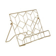 Featuring a geometric style on backrest, the Vertex luxurious matte gold finish cookbook stand has an adjustable angle rest to read the recipe book from the desired position. The front rail holds the book and ensures that the right page remains open.