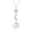 Bronte is a gorgeous mix of timeless classic meets celestial style. She features a pave crystal adorned north star & crescent moon each with a small pearl stone dropped from a delicate silver chain. Hanging underneath the celestial charms is a large pearl adding a beautiful finishing touch.
