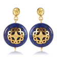 These exquisite Drop earrings are part of Melange collection. They feature hand carved and polished Lapis. The gemstones are set within a beautifully crafted gold filigree design.