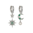 Our mismatched Moon and Star Motifs are embellished with a faux pearl, emerald green and clear cubic zirconia, watch them sparkle as you move.