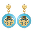 These exquisite Drop earrings are part of Melange collection. They feature hand carved and polished natural Turquoise. The gemstones are set within a beautifully crafted gold filigree design.