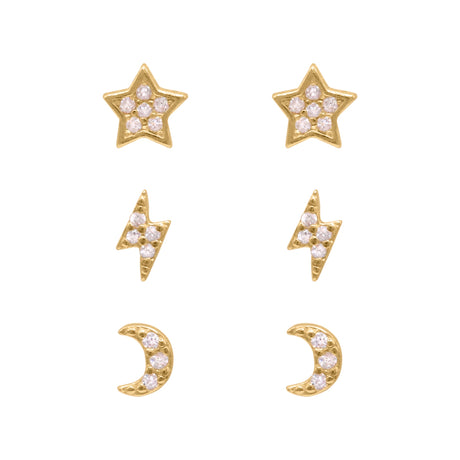 Miku Lightning, Moon & Star Stud Earrings Set | 18K Gold Plated