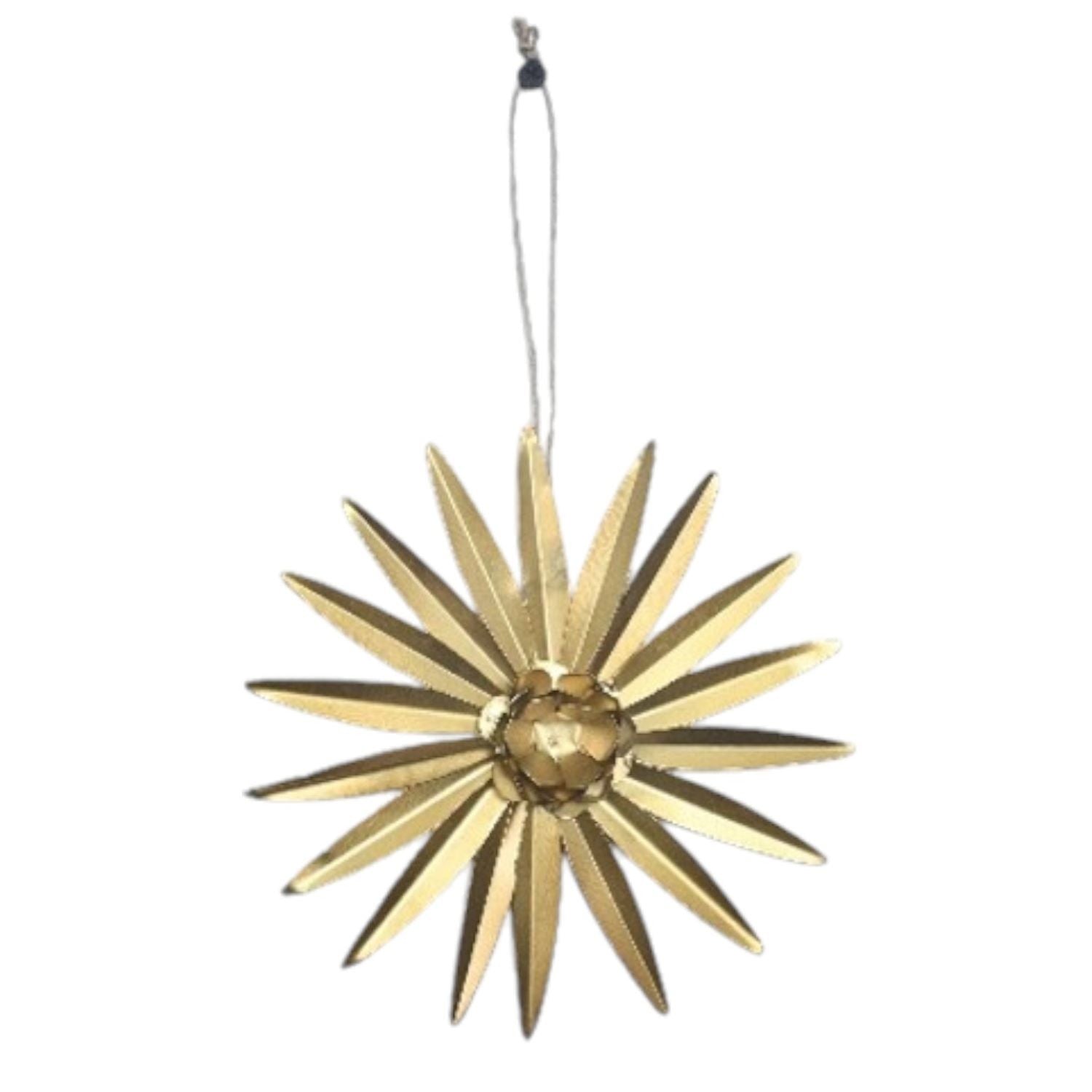 Starbust Snowflake Hanging Ornament : Crafted from metal with an intricate starburst design, this ornament features delicate floral details and star accents radiating from the center.
