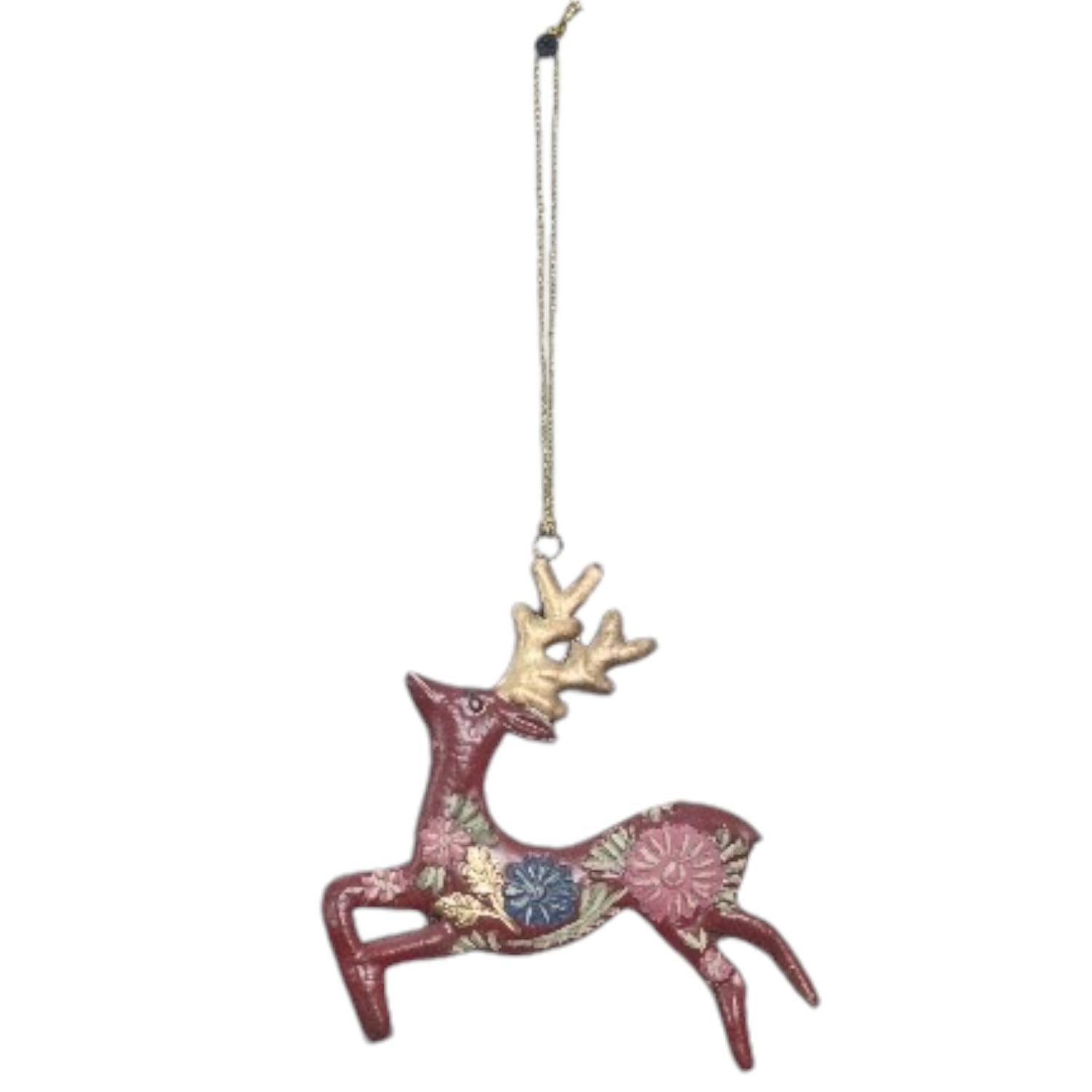 Metal Reindeer Large : Reindeer Figurine, a delightful nod to retro-inspired festivities. Painted in a vibrant red with intricate designs on both sides, this reindeer exudes timeless elegance and a touch of whimsy.