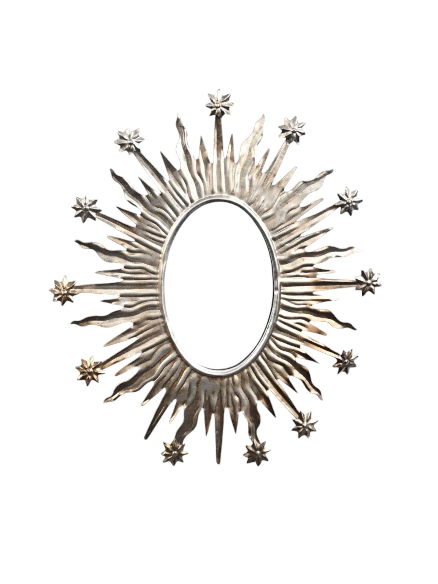 This stunning oval mirror is framed by radiant rays of light, adorned with intricate stars crafted from embossed and finely cut golden tinplate, all finished with an elegant antique patina. A perfect gift for a loved one or a unique wedding present, it exudes timeless charm and sophistication.