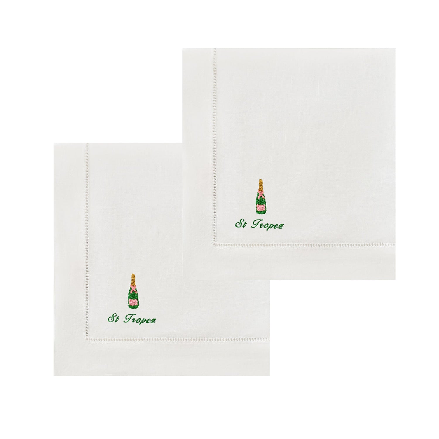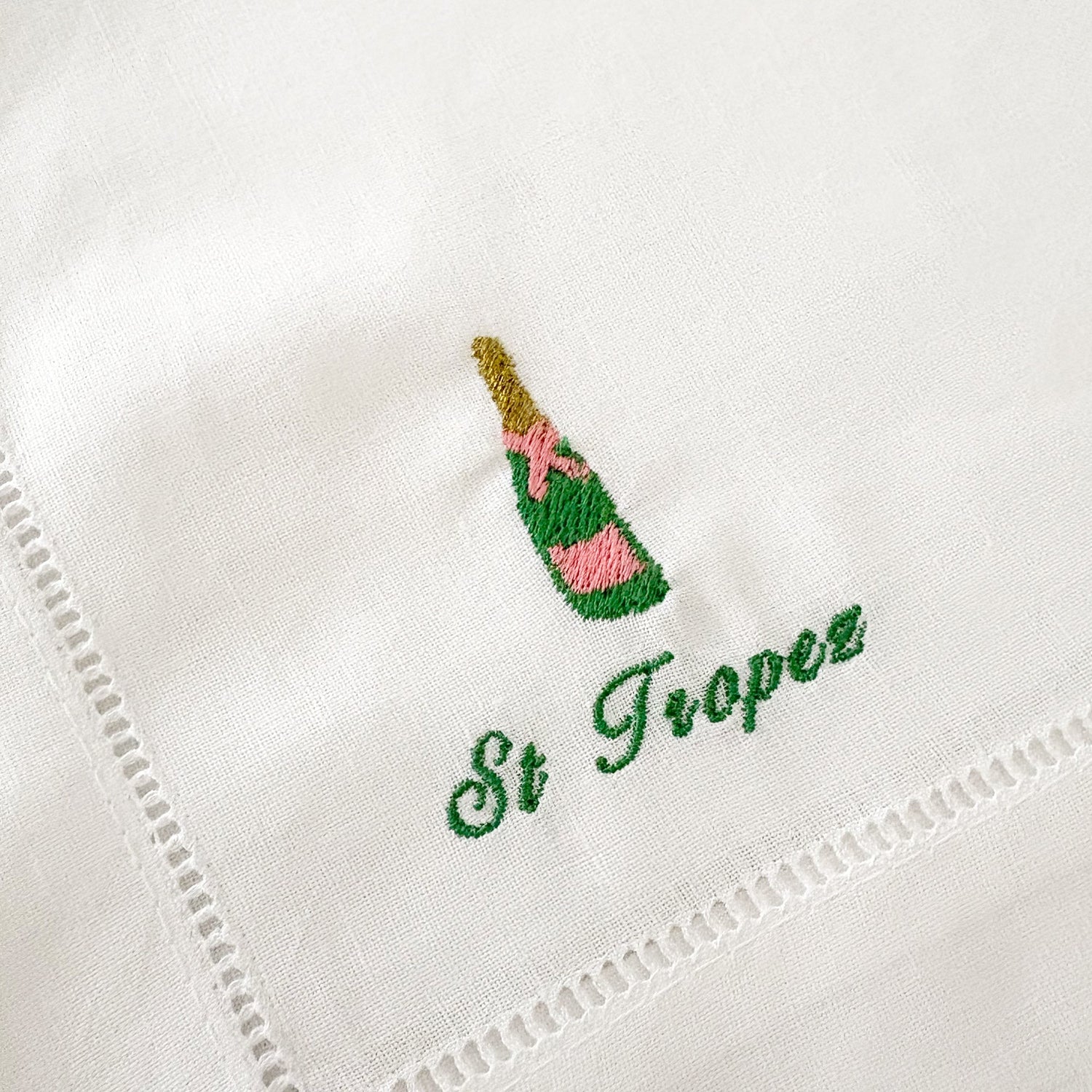 Add a unique and thoughtful touch to your home decor or entertaining essentials with this set of embroidered reusable beach champagne design napkins! Add your own text and make it personal. Perfect for adding some personal flair and easy elegance to any occasion. These cocktail napkins are made from soft, absorbent cotton with a linen-like texture that is both durable and eco-friendly. At 40 x 40 cm, they are just the right size for any dinner party, cleaning up spills.