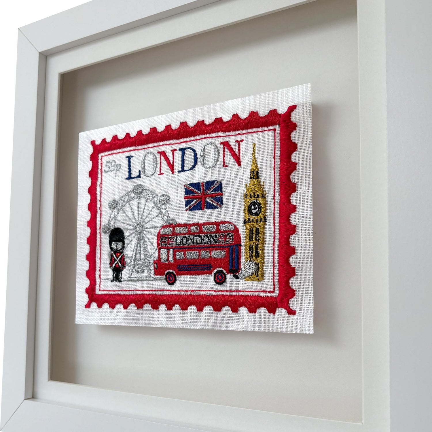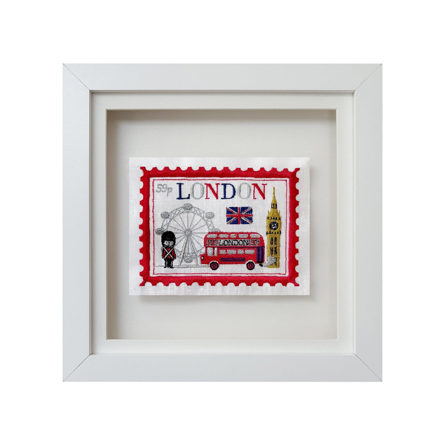 I wanted to create a range of unique embroidered stamps from all over the world, starting with London; these are bright and fun with a playful twist. We stitch all of these in our London studio and use beautiful floating frames.