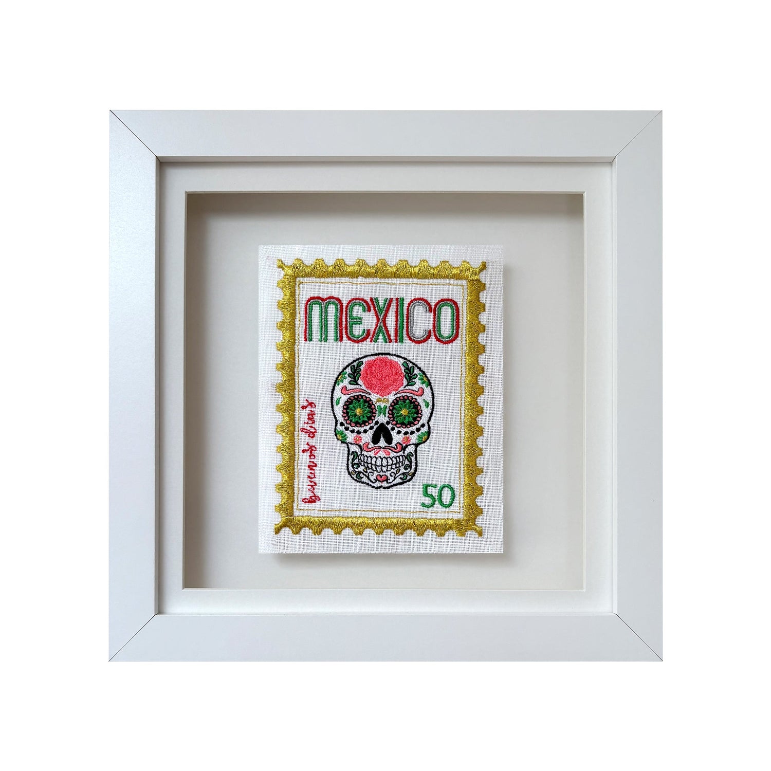 I wanted to create a range of unique embroidered stamps from all over the world, I love the colours on this design, Mexico; these are bright and fun with a playful twist. We stitch all of these in our London studio and use beautiful floating frames.