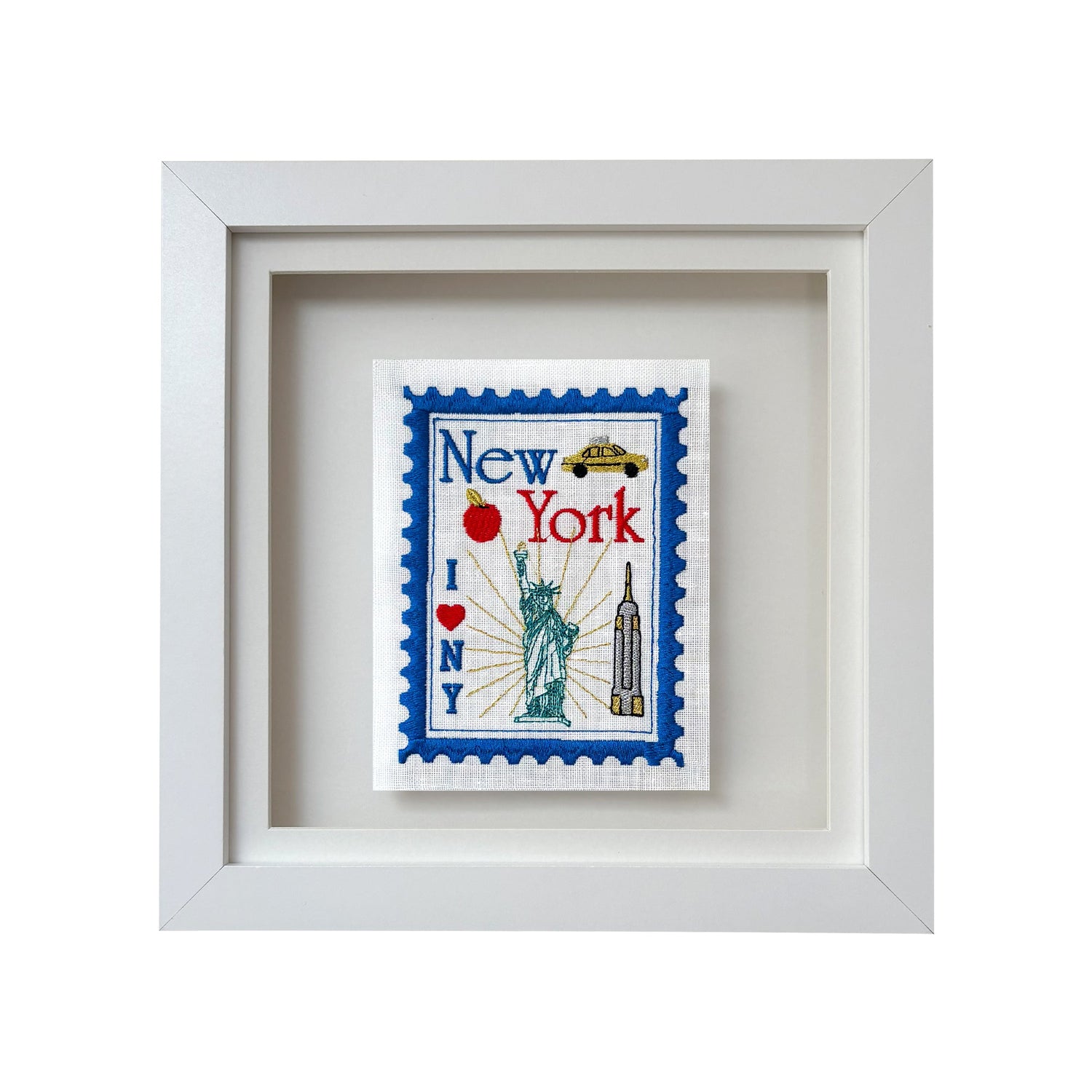I wanted to create a range of unique embroidered stamps from all over the world, inspired by one of my favourite cities New York; these are bright and fun with a playful twist. We stitch all of these in our London studio and use beautiful floating frames.